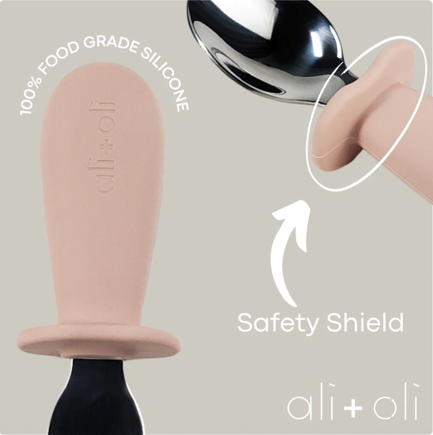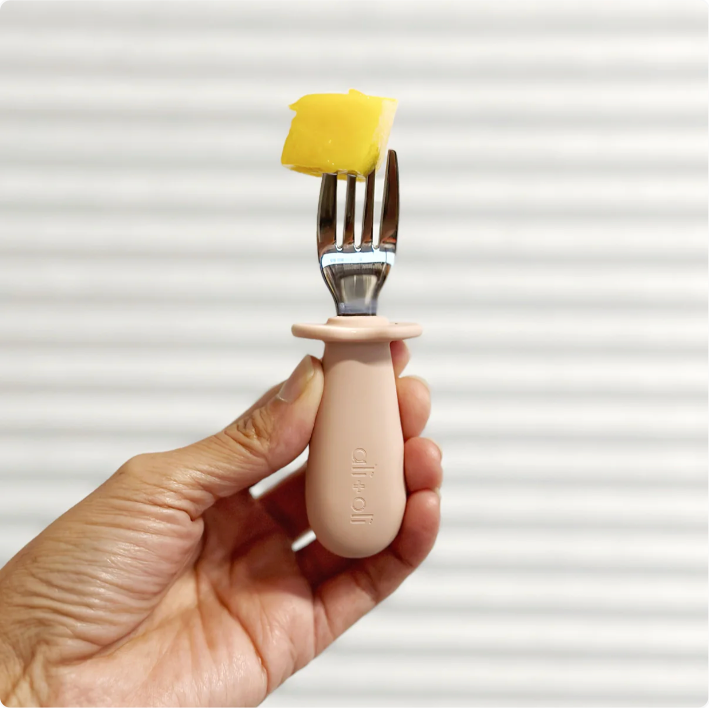 Our toddler learning spoon and fork set is perfectly sized for little hands to encourage self-feeding with chunky easy-grab handles.
