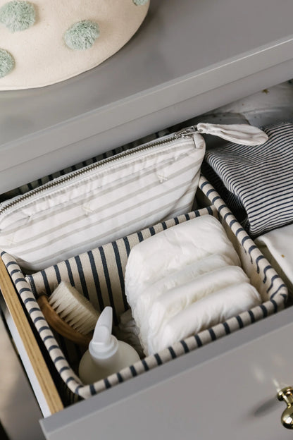 Organization but make it cute! We love our Hideaway Caddy Organizer for its portable size, squared sides and optional divider. Now available in four of our classic stripe colors, fit it under the crib, in a drawer, on a shelf or in your other Hideaway Storage sizes.